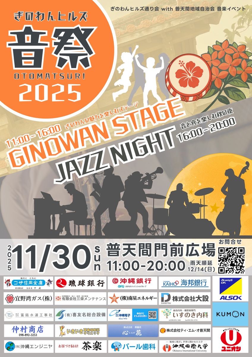 11月30日(日)普天間門前広場にて、日頃から普天間地域をご利用いただいている地域の皆様へ感謝の気持ちを伝える事業として「ぎのわんヒルズ音祭」を開催いたします。ぎのわんヒルズ通り会が中心となり、普天間1区自治会、普天間3区自治会と協力して開催する地域密着/参加型イベントです。(宜野湾市地域づくり推進事業基金助成事業)神社仏閣が鎮座し地域住民が住まう古き良き普天間の伝統を大切にしながら、新たに加わった住人や入域してくる人々達(米軍基地、県外や海外からの移住者や観光客、琉大医学部や病院関係者)と相互に理解しあいそして、だれもが楽しく共生できる地域となることを目的として、本イベントを「新たな普天間の魅力を発信できる場」として位置付けています。美味しい宜野湾の食と心地よい音楽を楽しめる、そんなひとときをお届けします。たくさんの出演者、出店者、協賛のご協力をいただいております。感謝感激です! ぜひ、遊びに来てくださいね♪ (※普天満宮、神宮寺駐車場は利用できません。公共交通機関もしくは普天間市民駐車場をご利用ください。)